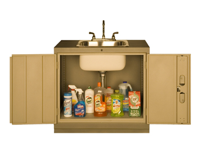 Using the E-510 two door cabinet, a 10” deep stainless steel sink is added for general use in the garage. This cabinet is made from a fully welded construction and comes with a forged aluminium lockable handle.