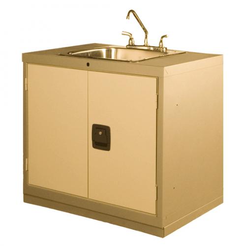 Using the E-510 two door cabinet, a 10” deep stainless steel sink is added for general use in the garage. This cabinet is made from a fully welded construction and comes with a forged aluminium lockable handle.