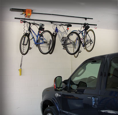 The Garage Gator, at the push of a switch, will raise or lower eight 30lb bikes or 220lbs of your most frustrating clutter now sitting on your garage floor up to the ceiling.