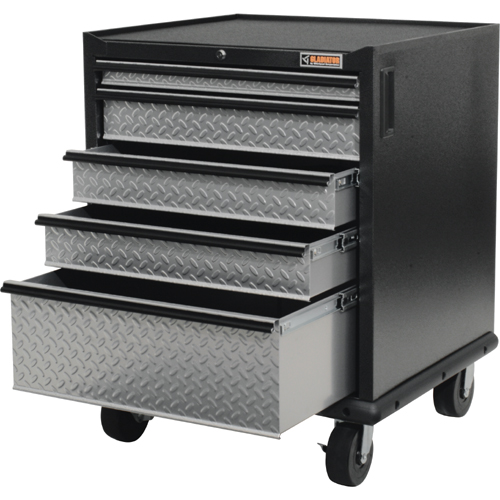At 24 in. deep, the Modular GearDrawer cabinet provides superior storage capacity over typical 18 in. deep cabinets. Each of the five drawers ride on full-extension ball bearing slides for smooth operation, include cushioned drawer liners, and are varied in size to accommodate an assortment of tools and garage gear. The 2 in. drawer is perfect for organizing hand tools, while the cavernous 8 in. deep bottom drawer swallows up large tools such as circular saws. The bulk of the storage capacity comes from the three 4 in. drawers, which are perfect for cordless drills and larger hand tools.